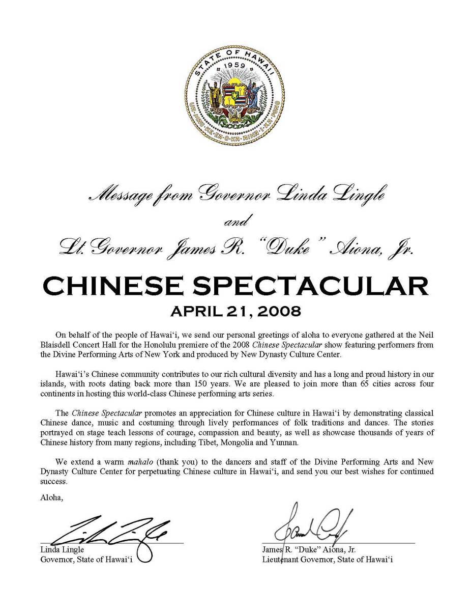 我们向神韵纽约艺术团和新!唐!人:文化中心的表演艺术家及工作人员们为在夏威夷弘扬中华传统文化,致以诚挚的感谢,以及对(你们)继续的成功呈上我们最美好的祝愿。