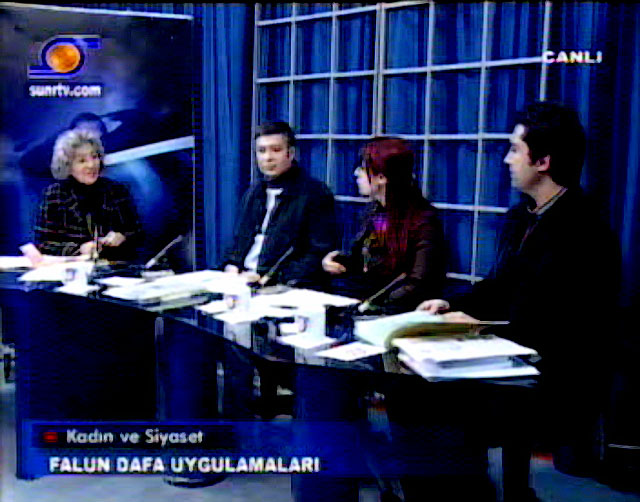 ![]() 节目主持人伊尔涵•阿堪女士(左一)与受邀接受专访的法轮功学员们 |