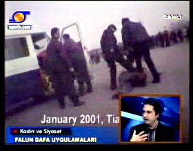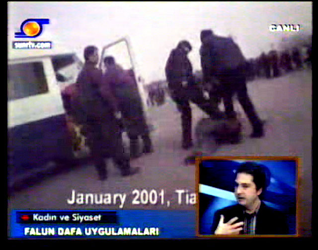 ![]() 电视上播出中共警察残酷殴打法轮功学员的画面 |