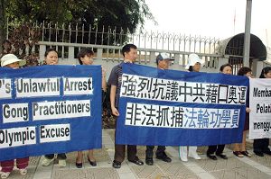 ![]() 马来西亚法轮功学员:“强烈抗议中共借口奥运非法抓捕法轮功学员。” |