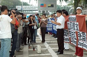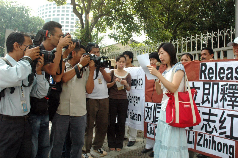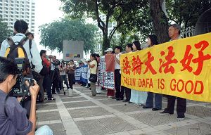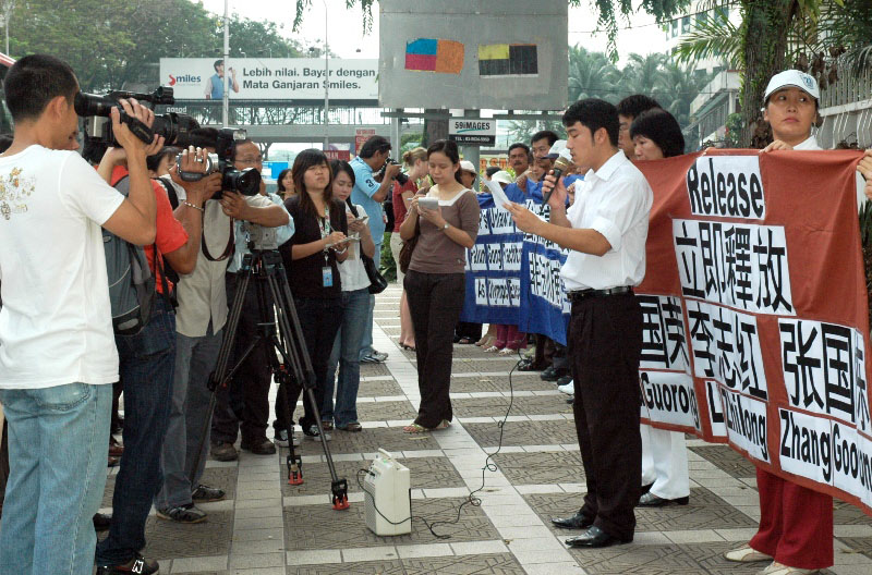 抗议活动上,法轮功学员打着中文及马来文横幅向中共抗议,并呼吁立即制止迫害法轮功。横幅内容为:“法轮大法好”、“强烈抗议中共借口奥运非法抓捕法轮功学员”以及“立即释放刘国荣、李志红、张国栋”等。