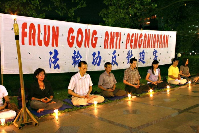 今天,印尼法轮功学员来到中使馆前,拉开横幅,举行烛光纪念活动,就是向世人表明法轮功反对迫害意愿。