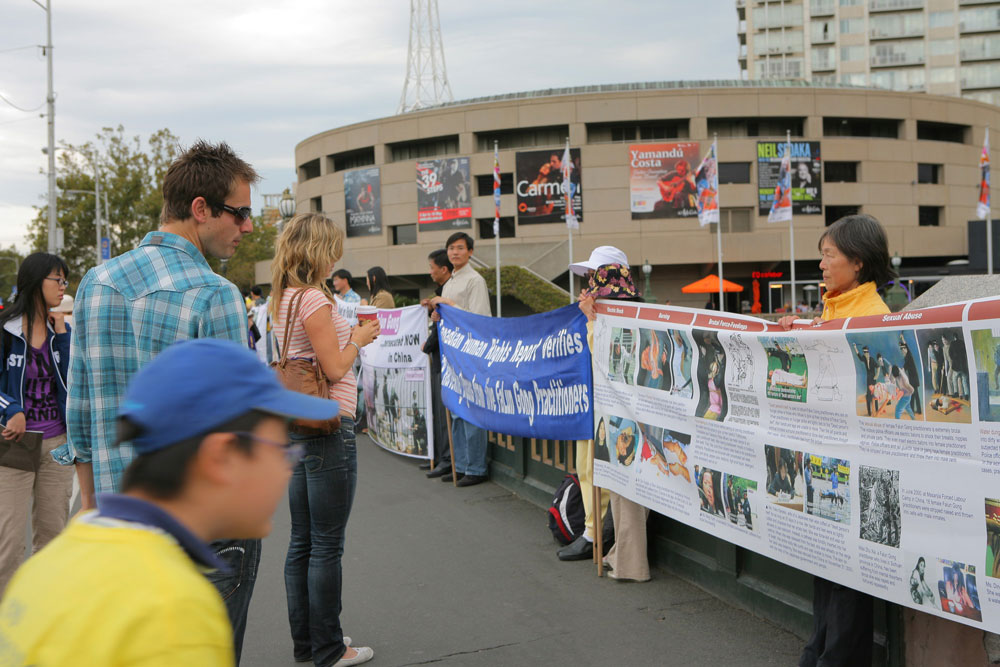 ![]() 过往民众主动与学员交谈了解法轮功真相 |