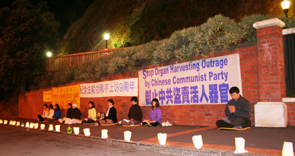 二零零八年四月二十五日晚,新西兰首都惠灵顿的学员来到中共驻新西兰大使馆前,进行烛光守夜,以纪念四二五法轮功学员和平上访九周年及悼念九年来被迫害致死的大法弟子。