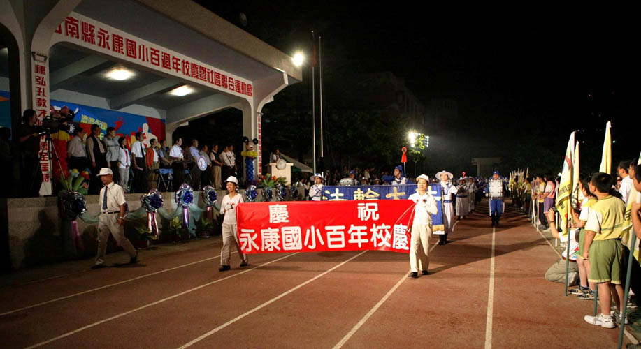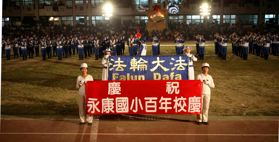 永康国小创校百年校庆获得总统陈水扁与国安会秘书长陈唐山的贺电,以及台南副县长颜纯左、立委、议员及多位校长莅临观赏。大会旗进场是由一百二十五位法轮功学员组成的天国乐团引领,场面壮观。随后的演奏节目精彩,令与会者赞叹不已。