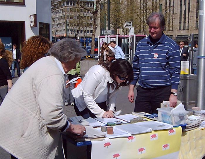 二零零八年四月二十六日,大法弟子们一如每个周六,站在德国杜塞尔多夫市(Duesseldorf)的信息展台边,向广大的民众介绍着发生在中国大陆的残酷迫害法轮功的真相。杜塞尔多夫的信息展台位于著名的海涅广场,这里是最繁华的商业地带,也是交通枢纽,还经常有来自各地的游客。左侧的酷刑和器官摘取展震惊过多少人,即使没读具体信息,一走一过那触目惊心的照片都会印在人的脑中。右侧是制止迫害的征签活动及功法展示,伴随祥和优美音乐的功法展示曾经吸引多少行人驻足,中共的“假,丑,斗”和大法弟子表现出的“真、善、忍”形成了鲜明对照,启发着民众的善根和正念。
