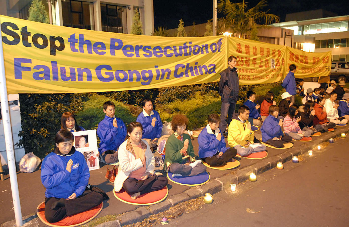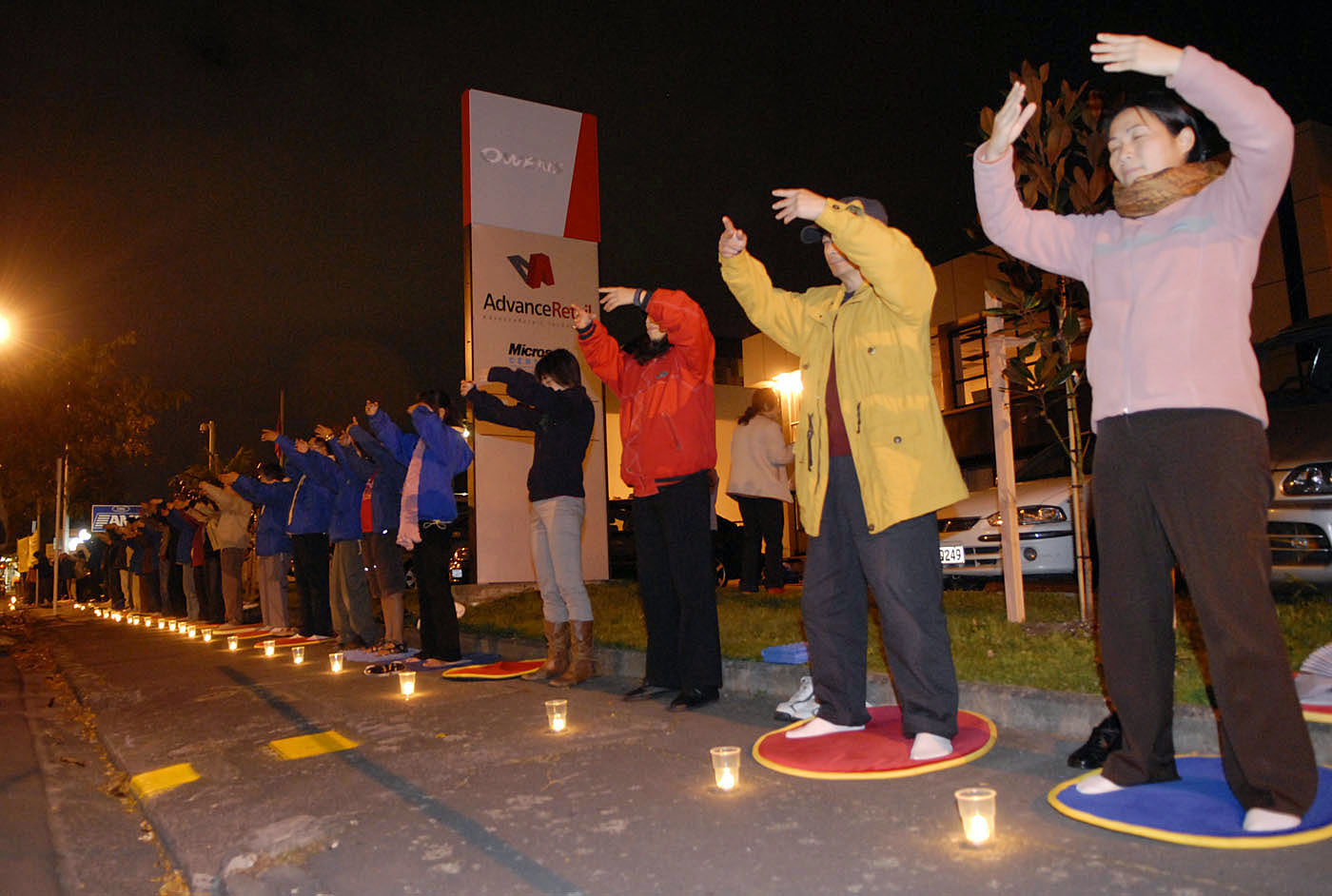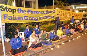 在中领馆前,法轮功学员手持“‘四•二五’和平上访九周年;停止迫害法轮功”等中英文横幅,伴随着庄严、肃穆的炼功音乐,演炼功法,在他们的前面,摆放着点燃的蜡烛,过往车辆鸣笛表达支持。