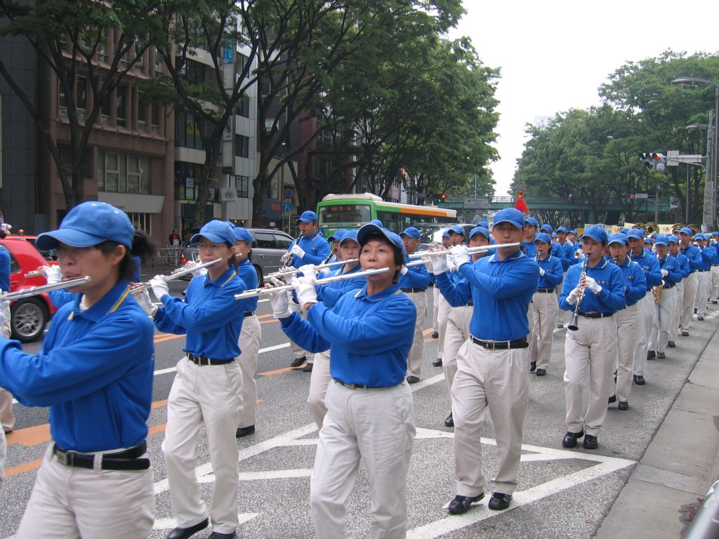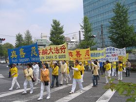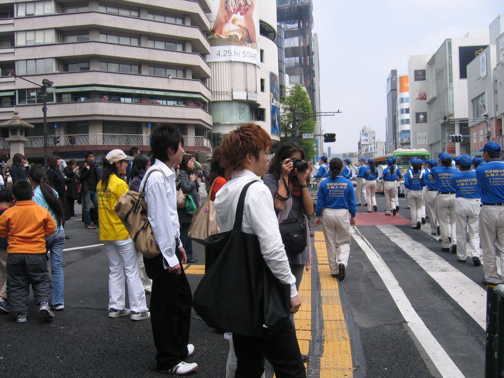 在集会后,法轮功学员分别在东京和横滨的主要街道举行游行。威风凛凛的天国乐团的演奏吸引了众多的行人,人们受到震撼,纷纷驻足观看,从街道两边的建筑里不断有人走出来或者跑到阳台上观看,许多人在拍照,并热烈的鼓掌欢迎。
