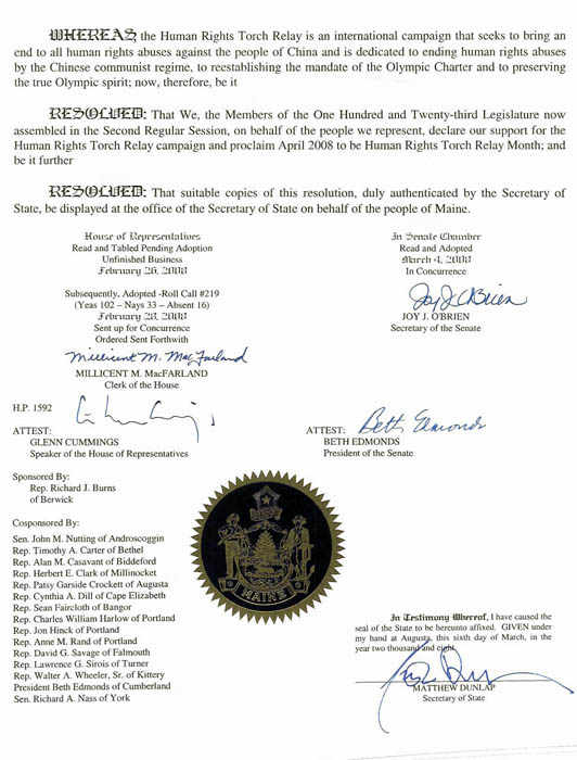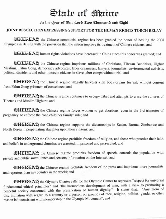 缅因州参众议院支持“人权圣火全球传递活动”的联合决议