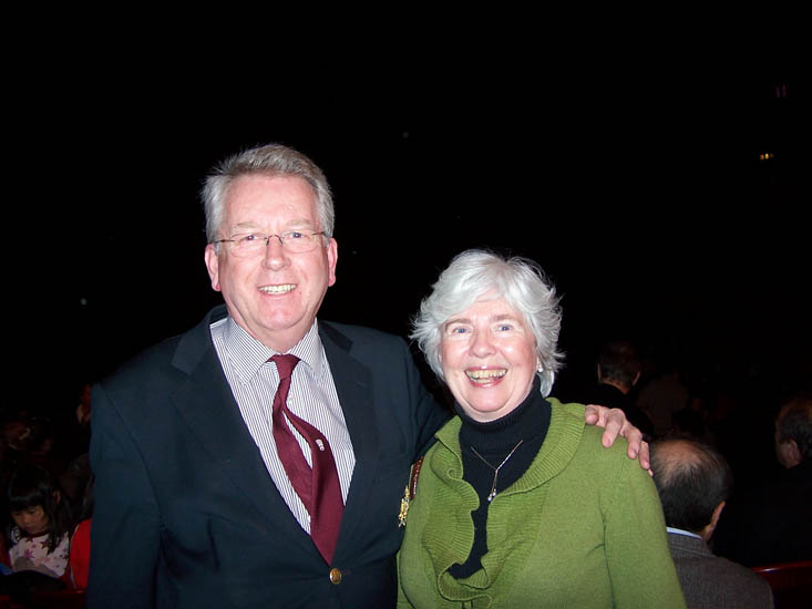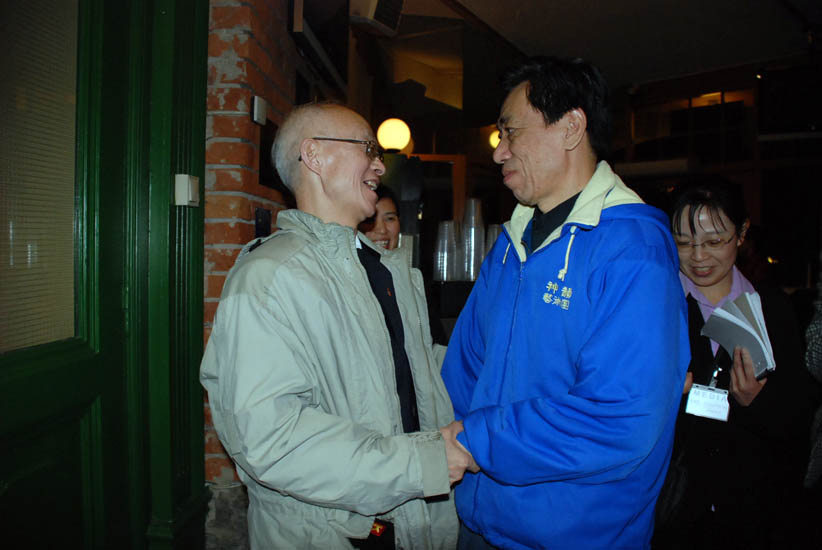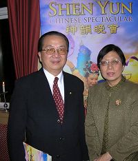 ![]() 陈世忠先生(左)和神韵艺术团歌唱家关贵敏先生(右)亲切交谈 |