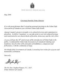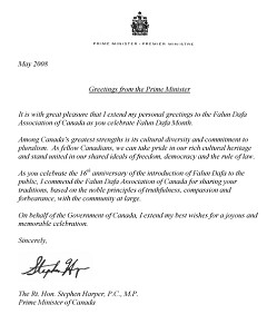 这是哈珀总理连续第三年为法轮大法日发来贺信,他在今年的信中说:“值此法轮大法月之际,我非常高兴向加拿大法轮大法学会表达我的祝福。”