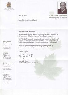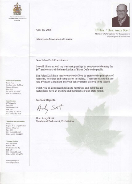 前联邦印第安事务部长、来自新布伦斯维克的国会议员斯考特(Andy Scott)在给法轮大法学会的贺信中说:“法轮大法一直在社会上推广祥和、忍让和善。很多加拿大民众都持有这些价值观,你们的成就值得赞扬。我祝愿你们永远身体健康和快乐,希望所有的法轮功学员都有一个令人激动和难忘的法轮大法月。”