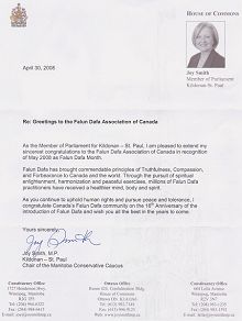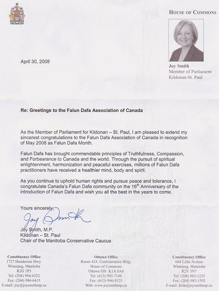 曼尼托巴保守党内阁主席、国会议员史密斯(Joy Smith)贺信中称:“法轮大法将真、善、忍这个值得敬佩的信念带给了加拿大和全世界。通过对精神升华的追求、圆容和祥和的炼功,亿万法轮大法修炼者获得了更加健康的身心和思想。”