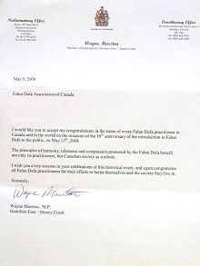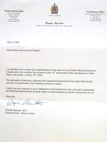 新民主党外交批评家、国会议员韦恩马斯通(Wayne Marston)发来贺信说:“值此法轮大法传世十六年之际,我希望加拿大和全世界的每一位法轮大法修炼者能够接受我的祝贺。法轮大法所倡导的平和、容忍和大善不仅仅让修炼者受益,加拿大社会也从中受益。我再次祝愿所有的法轮大法修炼者继续提升他们自己,并感谢他们所做出的努力。”