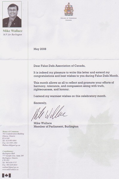 安省Burlington地区国会议员沃廉斯(Mike Wallace)在贺信中说,他非常高兴向法轮大法月表达祝福,“这个月让我们所有人都有机会反思和推广你们在祥和、忍让、善,还有真、正念和荣誉方面做出的努力。”
