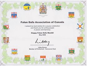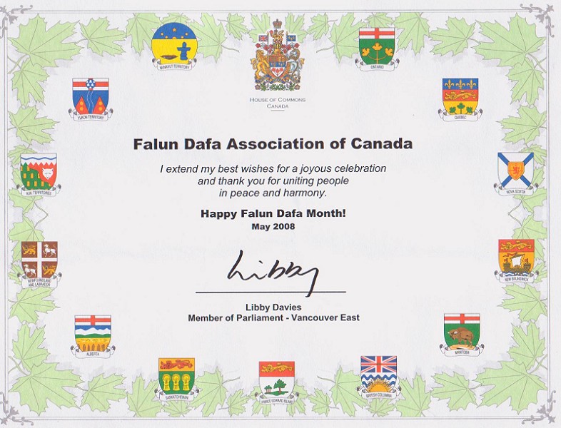 温哥华地区的新民主党国会议员戴慧思(Libby Davies)说:“我最真诚的祝愿节日快乐,同时感谢你们让民众拥有和平和祥和,法轮大法月快乐!”
