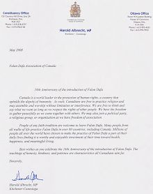 ![]() 安省Kitchener地区国会议员艾伯瑞撤特(Harold Albrecht)发来的贺信 |