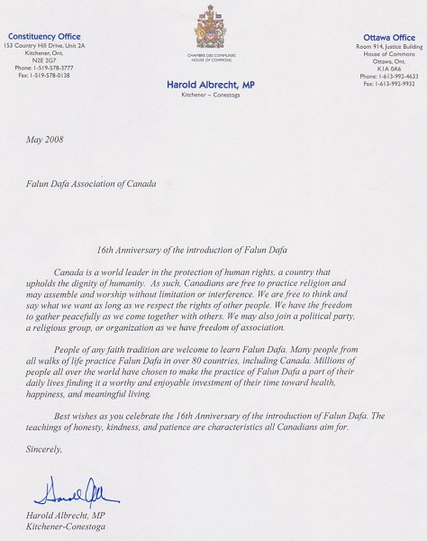 安省Kitchener地区国会议员艾伯瑞撤特(Harold Albrecht)在发来的贺信中说:“在八十多个国家,包括加拿大,来自各行各业的很多民众修炼法轮大法。全世界上亿人选择法轮大法作为他们生活的一部份”,法轮大法给他们带来了“健康、快乐和富有意义的生活”,“值此庆祝法轮大法传世十六年之际,请允许表达我最真挚的祝福。诚实、善良和忍让的教导是所有加拿大民众追求的。”