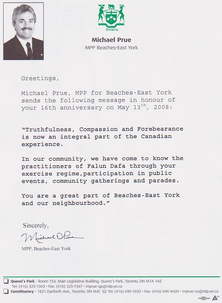 安省东约克地区的省议员珀如(Mihael Prue)在贺信中说:“真、善、忍现在是加拿大经历不可缺少的一部份。你们是东约克地区很棒的成员。”