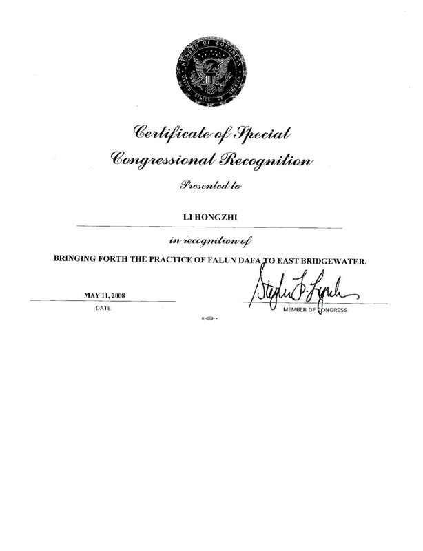 以表彰把法轮大法修炼洪传到美国麻州东布瑞芝瓦特(East Bridgewater)