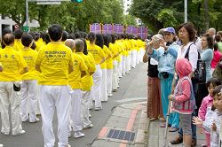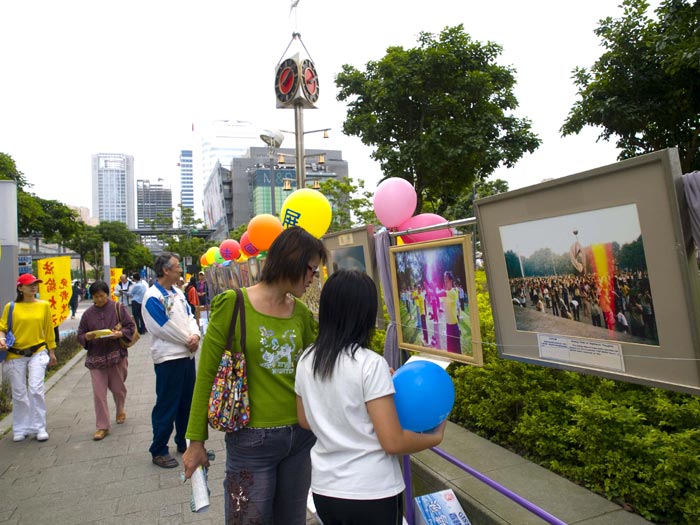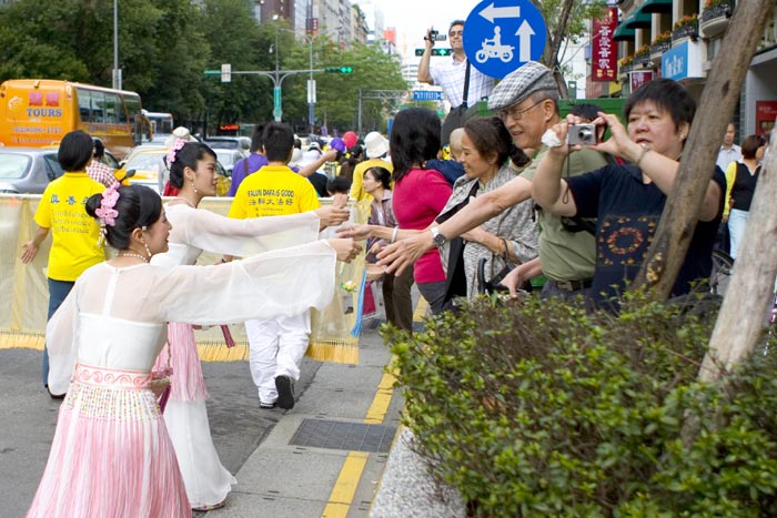 游行队伍经过信义、忠孝热闹的商圈,沿途不同路街、不同地点的路人游客:从事美发业的刘小姐、参观世贸商展的杨小姐、结伴坐在国父纪念馆外石椅休息的陈妈妈、詹妈妈和谢妈妈三人、庄先生夫妇等人,包括路旁值班的员警罗先生和林先生,看到大法弟子的游行队伍走过后都说,“感觉非常祥和,有秩序,很有精神,印象很不错。”经营健康食品的江先生还望着旗帜逐字念着:“法轮大法好”,大厦管理员常先生被吸引站在大楼门前走廊,观看游行队伍整队远去后直说,法轮功的游行很美很漂亮,感觉很祥和,很好。