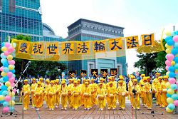 为了庆祝这个有意义的日子,花莲的法轮功学员也不约而同来了四、五十位。花莲的杨坤茂夫妇和二个小孩也在游行队伍当中,他表示,花莲学员之间并未互相邀约,大家都感受大法带给我们无限的美好与未来,也为了感谢与表达对师父的感恩,你也想来,他也想来,结果我们竟都搭了同一个班次的火车来到台北参加这庆祝活动。