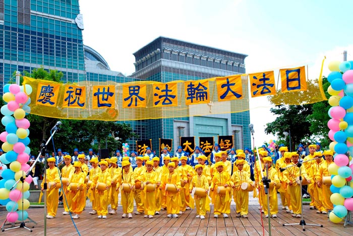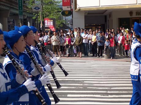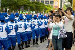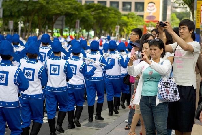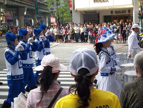 随后法轮功学员由雄壮威武的天国乐团引导下游行在热闹的信义、忠孝二大商圈,沿路民众争相传阅“法轮大法日特刊”,许多商家及逛街的人们被天国乐团的演奏声,以及法轮功小弟子可爱的腰鼓队所吸引,纷纷拿起手机、相机拍下这难得的画面。