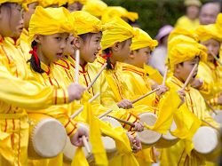 ![]() 沿路游行的法轮功小弟子腰鼓队,受到围观路人的称赞,连维持交通的警察表示,觉得这些小孩真棒,边打鼓边走了六公里的路,一刻都未休息还精神抖擞 |