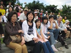 在邮局上班的张凯富和母亲与姊姊和妹妹都是大法弟子,今天全家出动带着小女儿和太太前来信义广场参加庆祝活动和游行,他们表示要来恭贺师尊生日快乐,觉得举行法轮大法洪传于世十六周年的庆祝活动很具意义,是让世人知道大法美好的一种快乐。姐妹俩手指向坐在场边的嫂嫂说,嫂嫂尚未得法,希望这个活动能让有缘人都得法,不要擦肩而过错失良机。