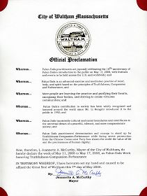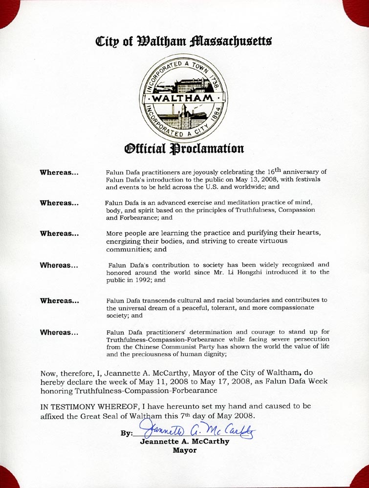 因此,现在我,渥萨姆市市长,珍妮特·麦卡锡,宣布二零零八年五月十一日至五月十七日这周为法轮大法周,以荣耀真善忍。