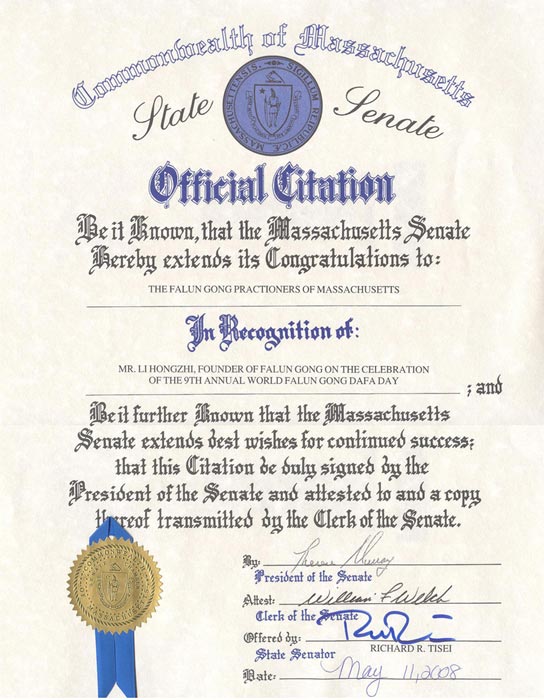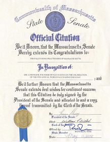 麻州参议院献上最美好的祝愿,祝不断取得成功。此褒奖状由参议院主席签署并由参议院秘书作证明和传递。