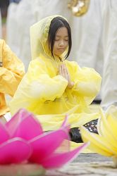 莲花出淤泥不染,象征修炼人内心的纯净与无暇,每一片莲花的花瓣代表和平与慈悲。小朋友在学炼这个“插莲花”舞蹈当中也历经一些小小考验:练习时间短促(一个月左右,每周一次),加上要互相配合展现舞蹈内涵,终于在一次坐下来面对面交流之后,小朋友以更加纯净的心态来练习,进步也非常的快。其中年纪最小的沈妹妹,虽然完全没有学舞经验,仍是很努力的学习,表现和几位哥哥姐姐相比,可是一点也不逊色喔!