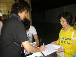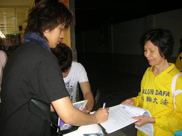 另有一群高中生经过,本来对法轮功学员所讲的真相是一头雾水,后来学员把揭露中共活摘器官的资料拿给他们看时,其中一位女同学惊讶的说:“好吓人!”学员说:你想想,台湾每年这么多人去大陆换器官,这些器官从哪里来?哪来这么多器官呢?其实现在加拿大独立调查团都已经调查出来了,的确是有中共活摘法轮功学员器官去贩售的事实。这位学生听了真相之后,正义与勇气油然而生,马上把前面那些同学通通叫回来签名支持反迫害。