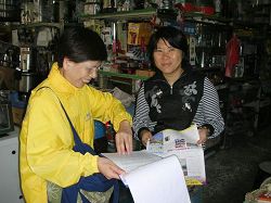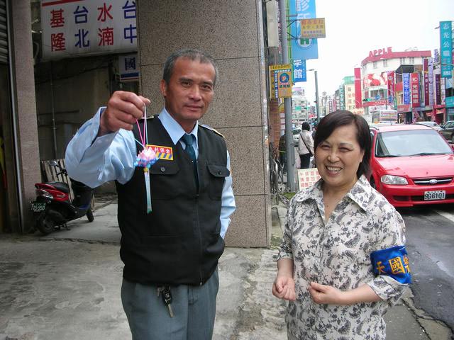 中正路上开店的老板收到法轮功小学员送的莲花书签,非常开心,小学员说:“请记住‘法轮大法好’。”老板直笑说:“好!好!”还一边照相一边拍拍两位小朋友的肩膀,给予衷心的敬佩与鼓励。