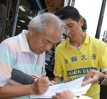 李先生和邓先生两人,曾去过大陆做生意。他们表示了解法轮功的美好,也亲身见证中共无理的打压,其中一位因为去大陆做生意被密报携带《转法轮》而被中共非法关押多日。看到游行队伍,他们毅然签下大名。另有一些台商身份的路人,也表示知道中共迫害法轮功的真相,他们有的低调表示担心签名会影响生计及安危。足见中共专制蛮横的流氓的心态,给人民及这个世界带来多少恐惧。