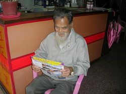 ![]() 原本孤孤单单坐在椅子上发呆的刘先生,看到法轮功真相资料之后,很开心的笑。 |