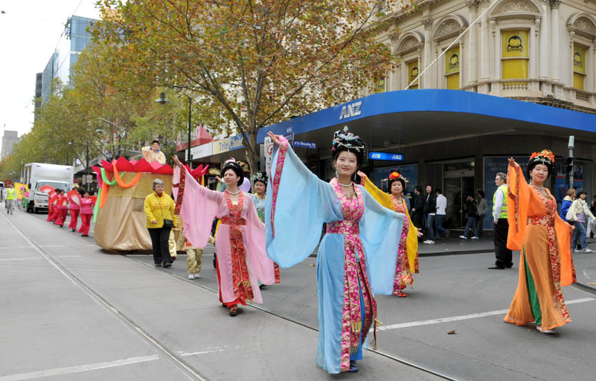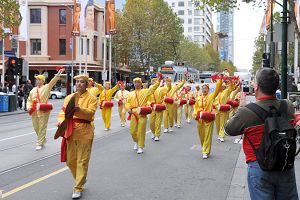 在墨尔本市中心的游行队伍气势壮观。腰鼓队打头,鼓声整齐有力;紧随其后的是莲花车、唐装舞和扇子舞。第二个方阵是悼念被中共迫害致死的法轮功学员、反迫害酷刑展以及揭露中共活摘器官模拟演示。