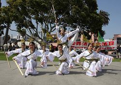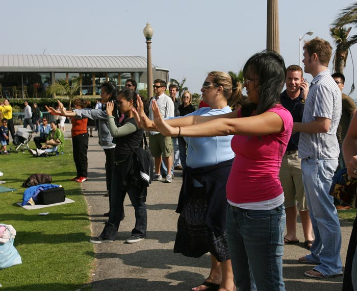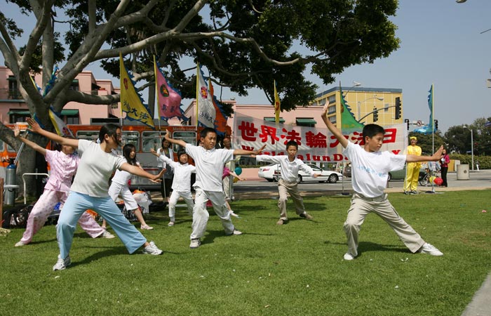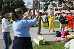 接下来,在唐鼓隆隆的鼓点中,由法轮功学员准备的丰富多彩的精彩表演逐一上场。来自不同族裔、不同年龄段的法轮功学员演示了五套功法,主持人讲解了五套功法的特点,介绍了法轮功已经洪传到世界上八十多个国家的情况。丰富的节目吸引了不少游客驻足观赏,并有不少观众跟着法轮功学员的动作,学炼功法。