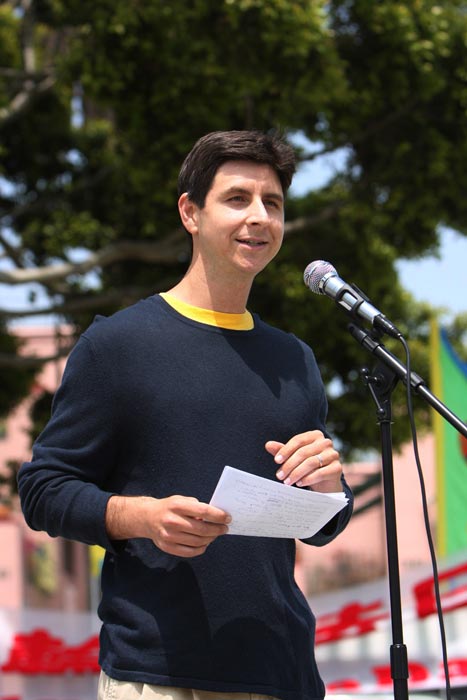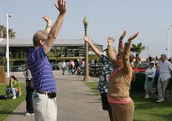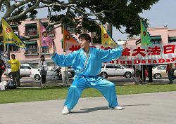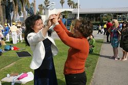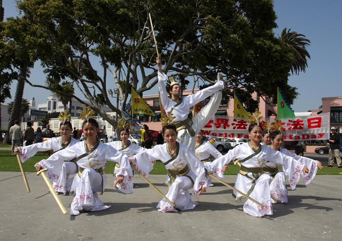 当天的洛杉矶风和日丽,圣塔莫尼卡海滨更是海风习习。下午一点半,庆祝活动从一首法轮功学员的贺词开始: