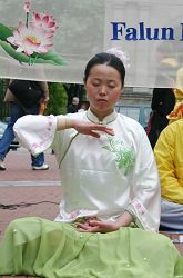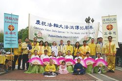 法轮功学员手持“法轮大法洪传世界十六载”、“法轮大法好”等横幅,传达了他们的心意,同时,学员们还向人们演示了法轮功功法;并表演了中国传统舞蹈“扇子舞”和“莲花舞”以赞颂法轮大法的美好。现场气氛充满祥和,观众发出阵阵掌声。