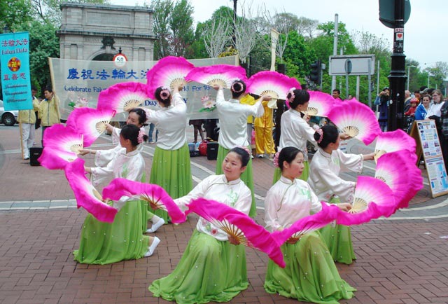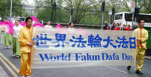 来自欧洲各地的部份法轮功学员在都柏林举办游行、表演中国传统舞蹈等欢庆大法洪传十六年。