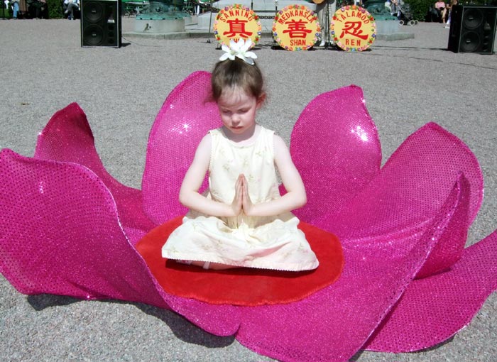 瑞典女孩琳尼阿(Linnea)今年五岁,住在斯德哥尔摩,全家人都修炼法轮功。当她还在妈妈肚子里的时候就和妈妈一起学法、炼功了。两岁开始和妈妈学唱歌,特别喜欢唱大法弟子创作的歌曲。从三岁起就开始和妈妈一起读《洪吟》和大法的书籍。她常常看到师父的法身,还有许多五颜六色的法轮。