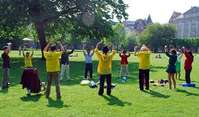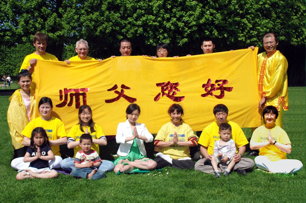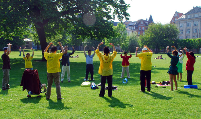 十二日上午,法轮功学员来到了哥本哈根市中心的国王公园,进行集体炼功。在这个坚持了十年的炼功场上,法轮功学员义务教功,自己出钱给新来的人提供资料,迎来送往了不知有多少人。在今天这样的特殊日子,就有三、四位来到现场学功,其中一位是专门从临近国家挪威来这里学功的艺术家。法轮大法就这样以口传口、心传心的形式,继续在世界的每一个角落被有缘人获知。