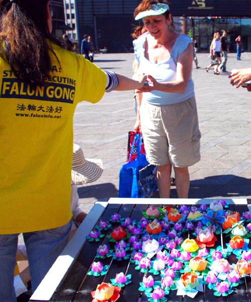 十一日下午,丹麦首都哥本哈根市中心的市政厅广场上,摆放着介绍法轮大法的展板与横幅。展板向人们介绍从一九九二年开始,法轮大法洪传世界的历程。横幅上是用丹麦文写着的“真、善、忍”, 以及“自从一九九七年以来,法轮大法在丹麦”。法轮功学员喜庆的心情溢于言表,他们为庆祝节日赶做的、以“法轮大法好”做莲心的纸莲花五彩缤纷。面对川流不息的人群,他们笑着递给人们资料和莲花。