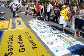 艳阳高照的丹麦夏日,是世界各国游客来这里观光的季节,这一天也是丹麦的节假日—— 五旬節。法轮功学员提供的丰富的介绍资料、祥和的炼功音乐、热情的笑脸,吸引了许多路人驻足观看。在北京奥运前夕,中国的人权迫害问题成为了丹麦民众关心的大问题,中共对法轮功的残酷迫害,更是人们或多或少都了解的事实。许多人自动走到“法轮功受迫害真相联合调查团”所发起的“百万征签反迫害”签名表前,郑重的签下他们的名字。