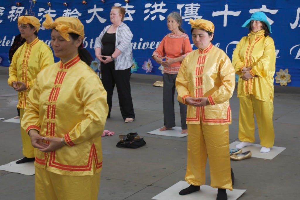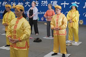 这个星期六在公园炼完功后,听说当天有“世界法轮大法日”庆祝活动,阿妮塔和珊蒂自己找到了鸽子广场,她们一到鸽子广场,立即被当日的庆祝活动氛围所感染。在其他学员的鼓励下,她们加入了身穿金黄色炼功服的法轮功学员的功法演示队伍。