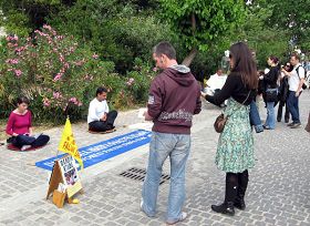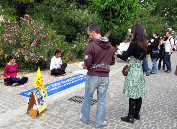 许多周末游玩或来参观雅典卫城遗址的人们饶有兴趣的停下来,了解法轮功的更多信息。当地学员详细的向人们讲解了什么是法轮功(又称法轮大法),修炼法轮功给人身心带来的升华,以及在雅典的免费义务教功点等信息。