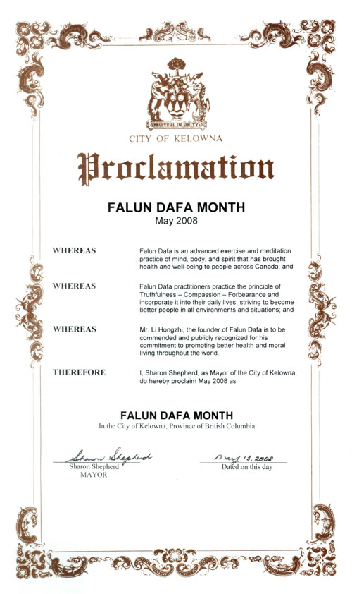 鉴此,我,卡罗纳市市长莎伦•谢波德(Sharon Shepherd),特此褒奖二零零八年五月为卡罗纳市“法轮大法月”。