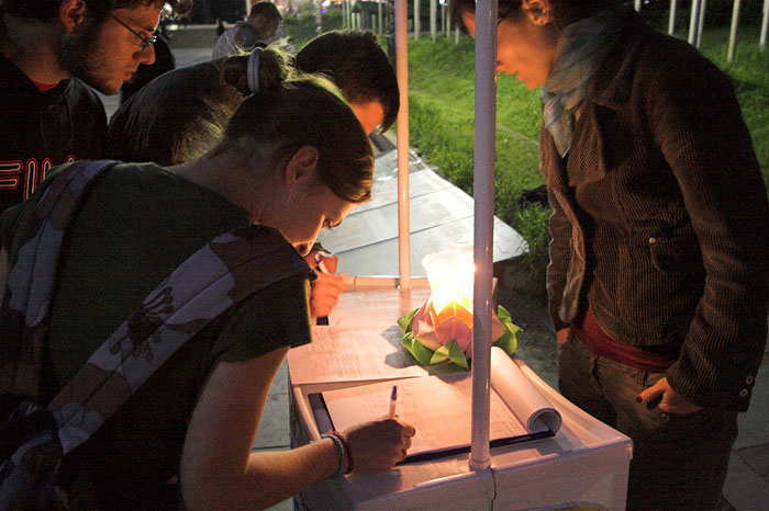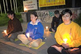 当夜幕降临,法轮功学员点燃了蜡烛,悼念因坚持信仰而被中共迫害致死的中国大陆同修。一旁,人们依然络绎不绝的来签名,表达他们对正义的支持。