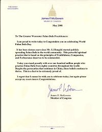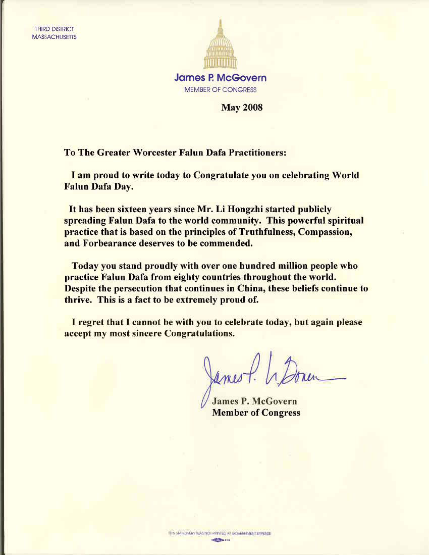 【明慧网二零零八年五月十七日】二零零八年五月,美国麻州国会议员詹姆斯•麦高文(James P. McGovern)致信大渥斯特(Greater Worcester)法轮大法学员,祝贺世界法轮大法日。信件译文如下: